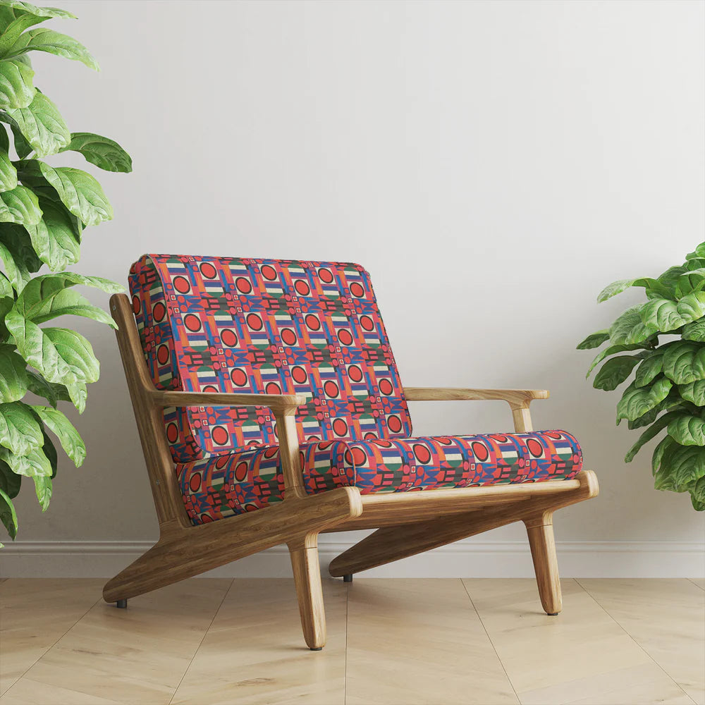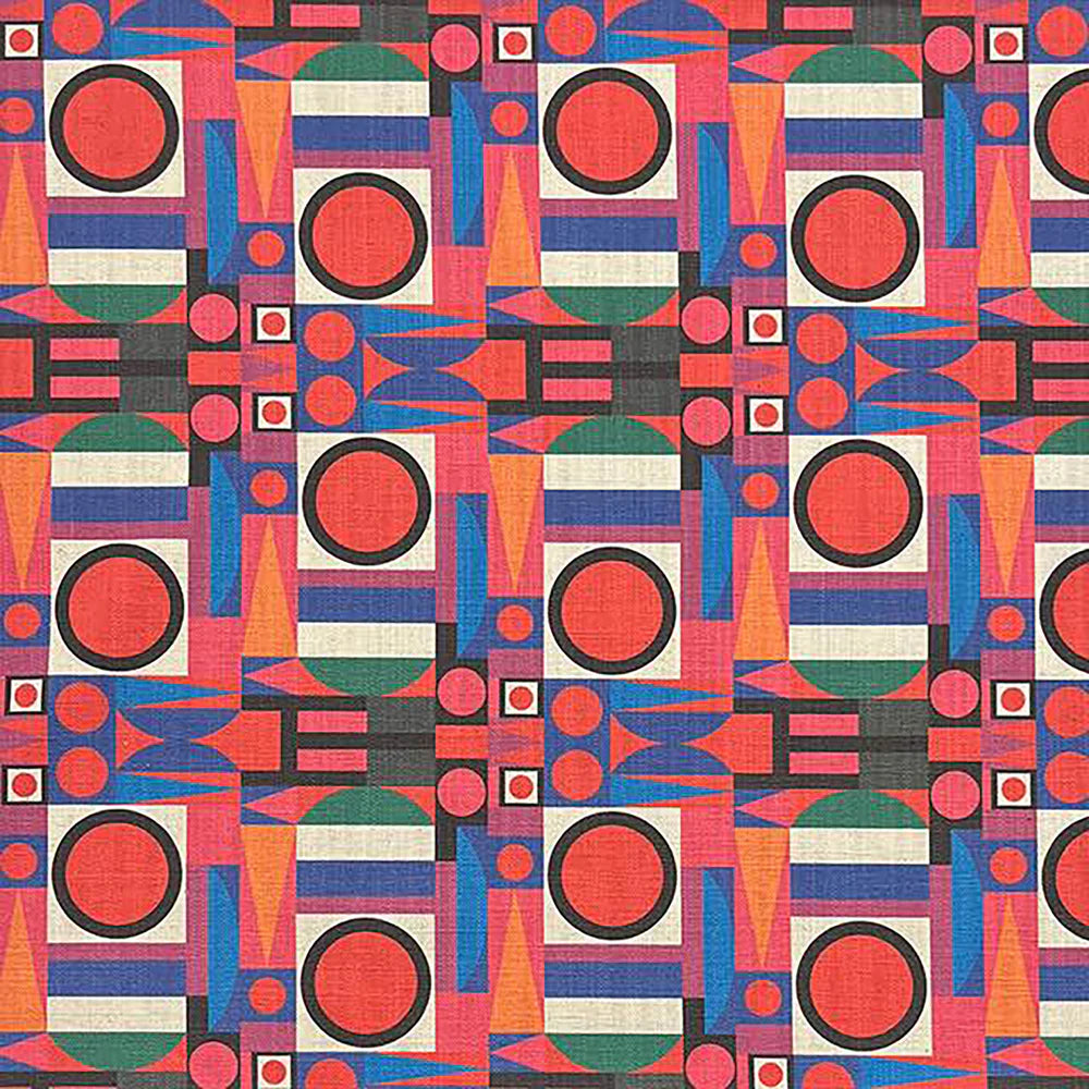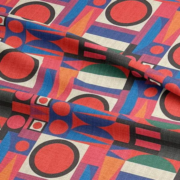 Weimar No.7 Upholstery Fabric bursts with rhythmic geometry and vibrant colour, drawing from the bold precision of Bauhaus design. Interlocking circles, columns, and triangles in pink, red, navy, green, and ivory form an energetic pattern with structured creativity. It's a multicoloured upholstery fabric that invites personality into both modern and eclectic spaces.