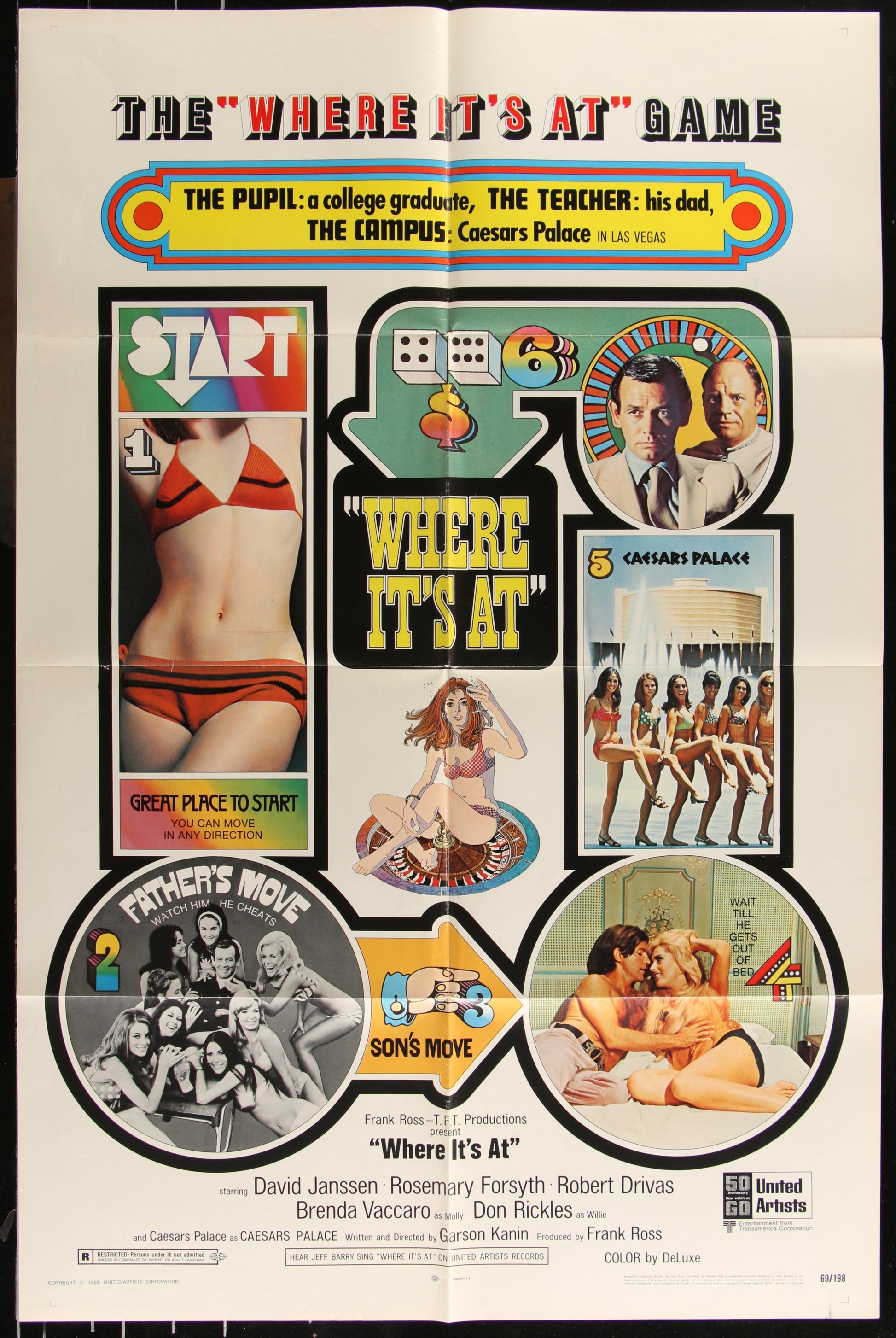 This folded one-sheet movie poster measures 27" x 41" [69 x 104 cm] and is for the 1969 Las Vegas gambling drama Where It's At, directed by Garson Kanin and starring David Janssen and Rosemary Forsyth. Some small holes can be found at the fold meet points, along with minor tears at the fold edges.