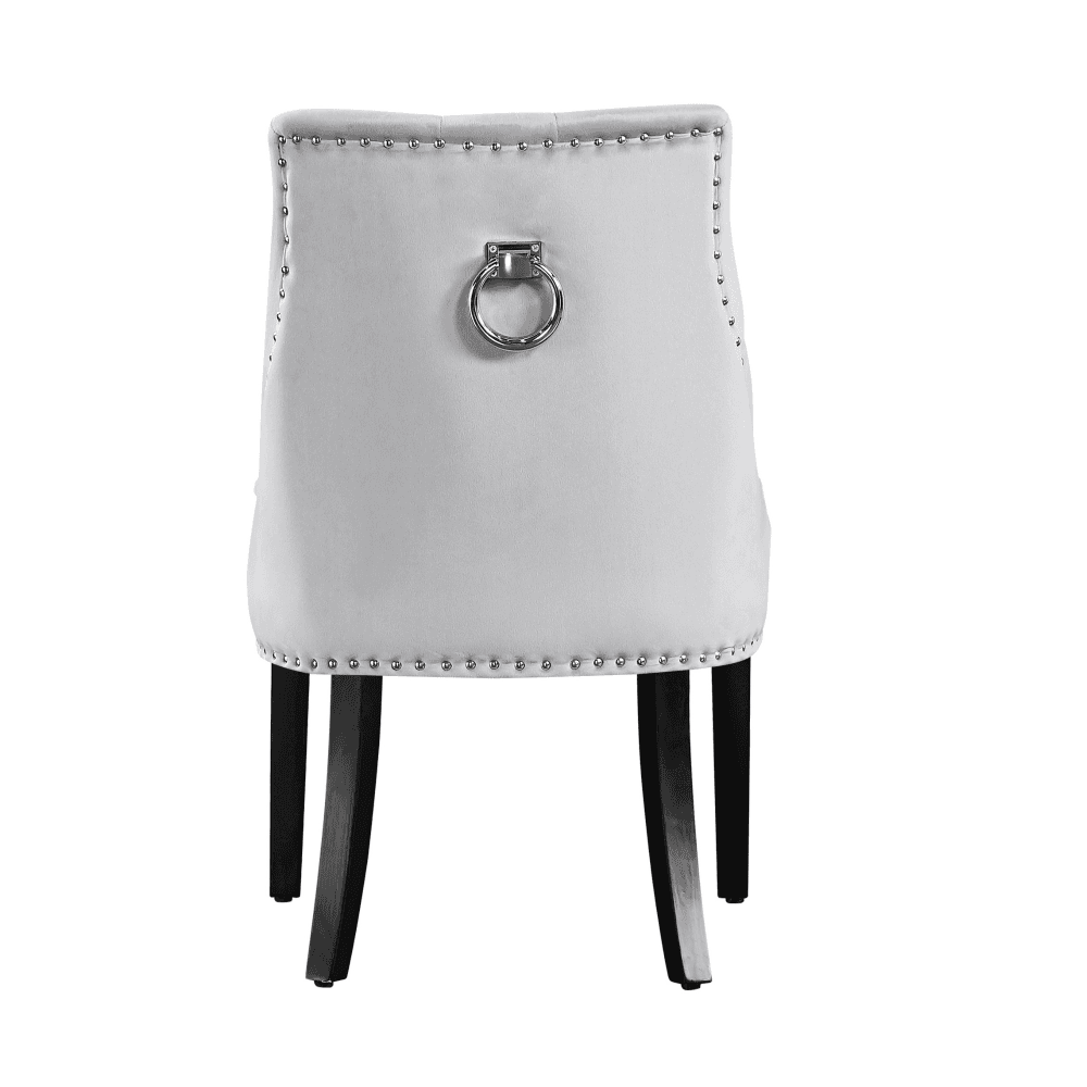 Paired with the Windsor Velvet Dining Chairs, this set exudes sophistication from every angle. Each chair features plush velvet upholstery, diamond tufting, elegant metal studs, and a decorative knocker handle on the back for a refined look. The padded seat and back provide exceptional comfort, while solid legs ensure long-lasting stability. From the intricate button detailing to the tasteful studwork, these chairs are the perfect blend of classic charm and modern luxury.