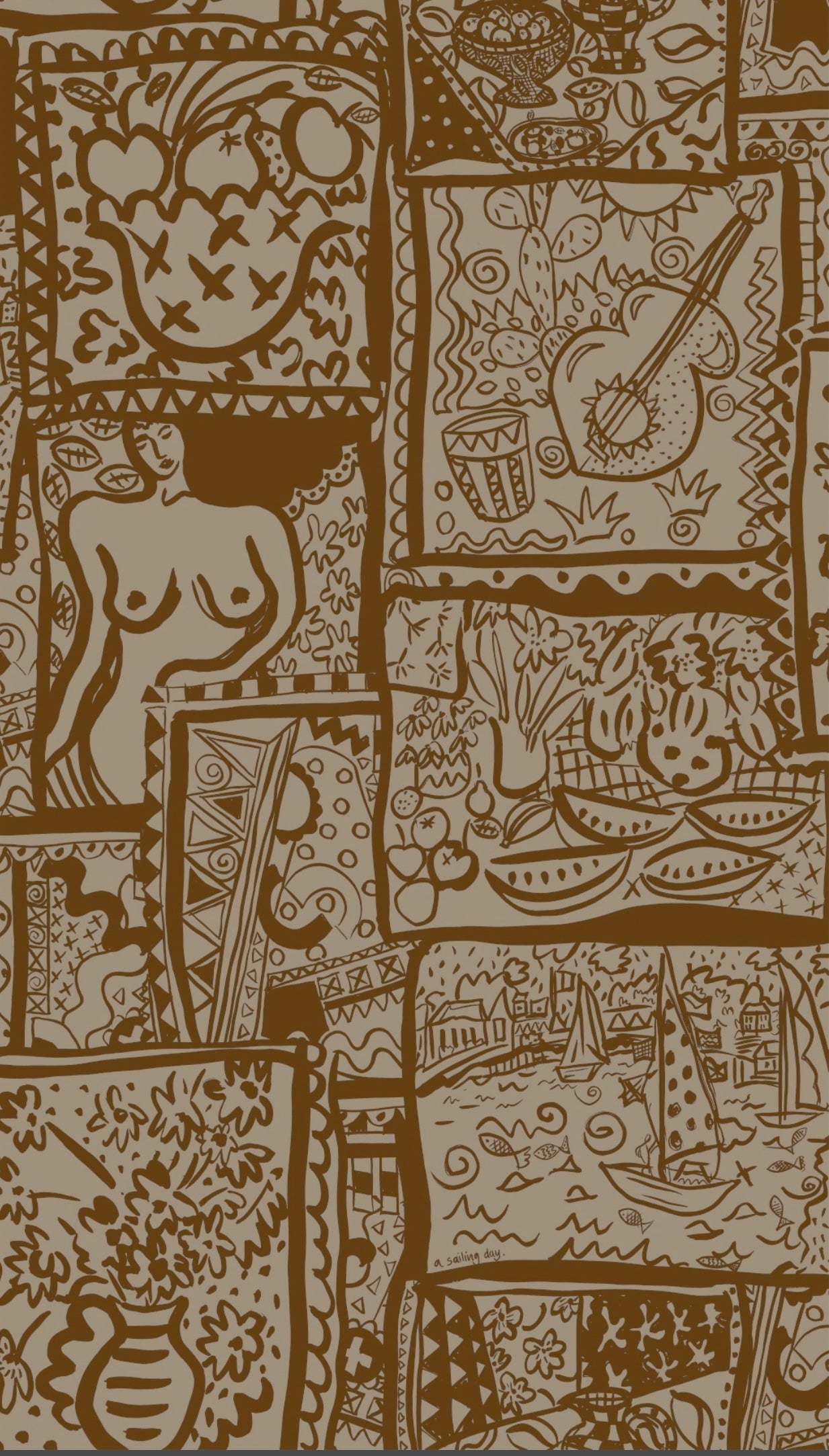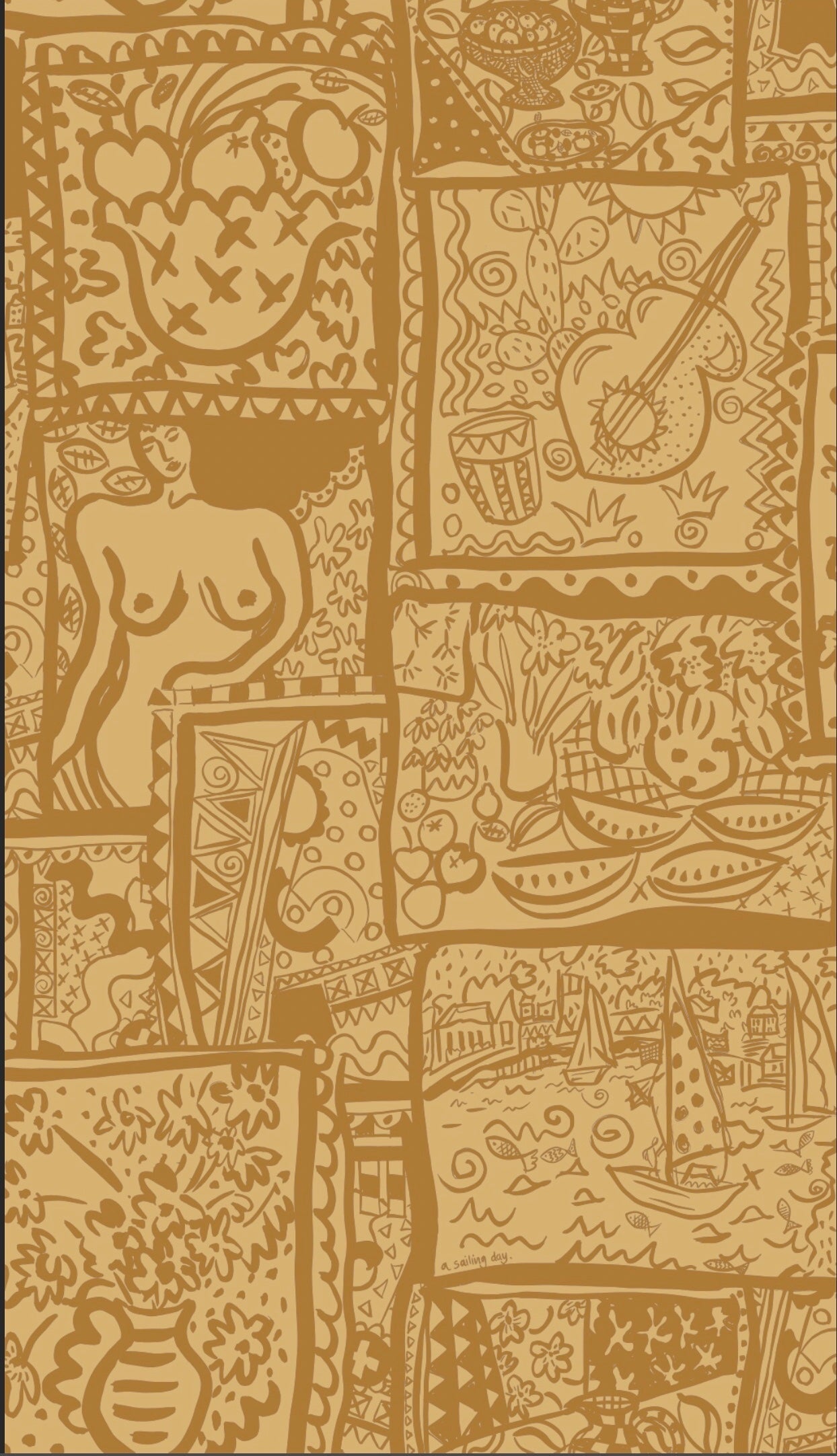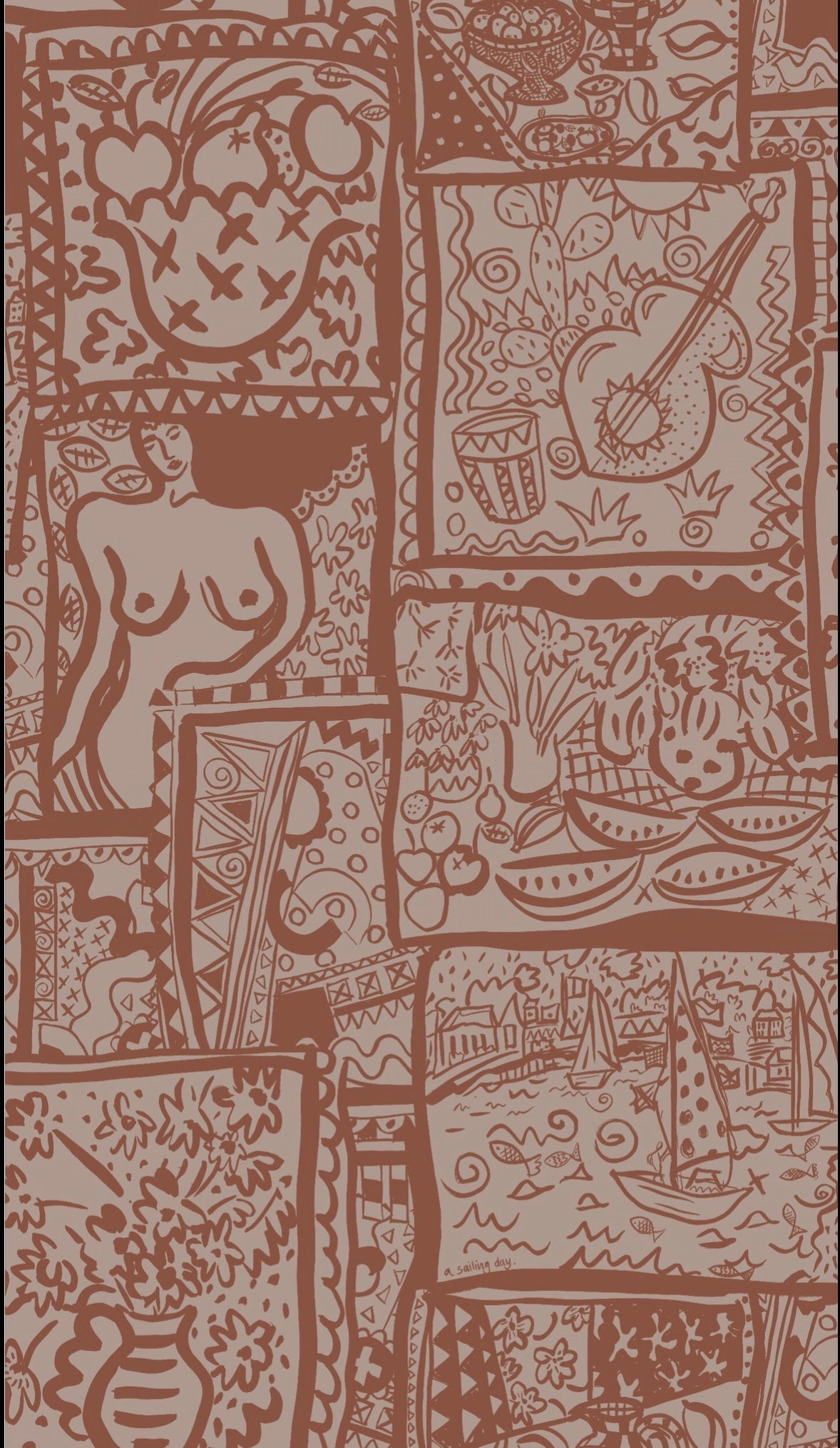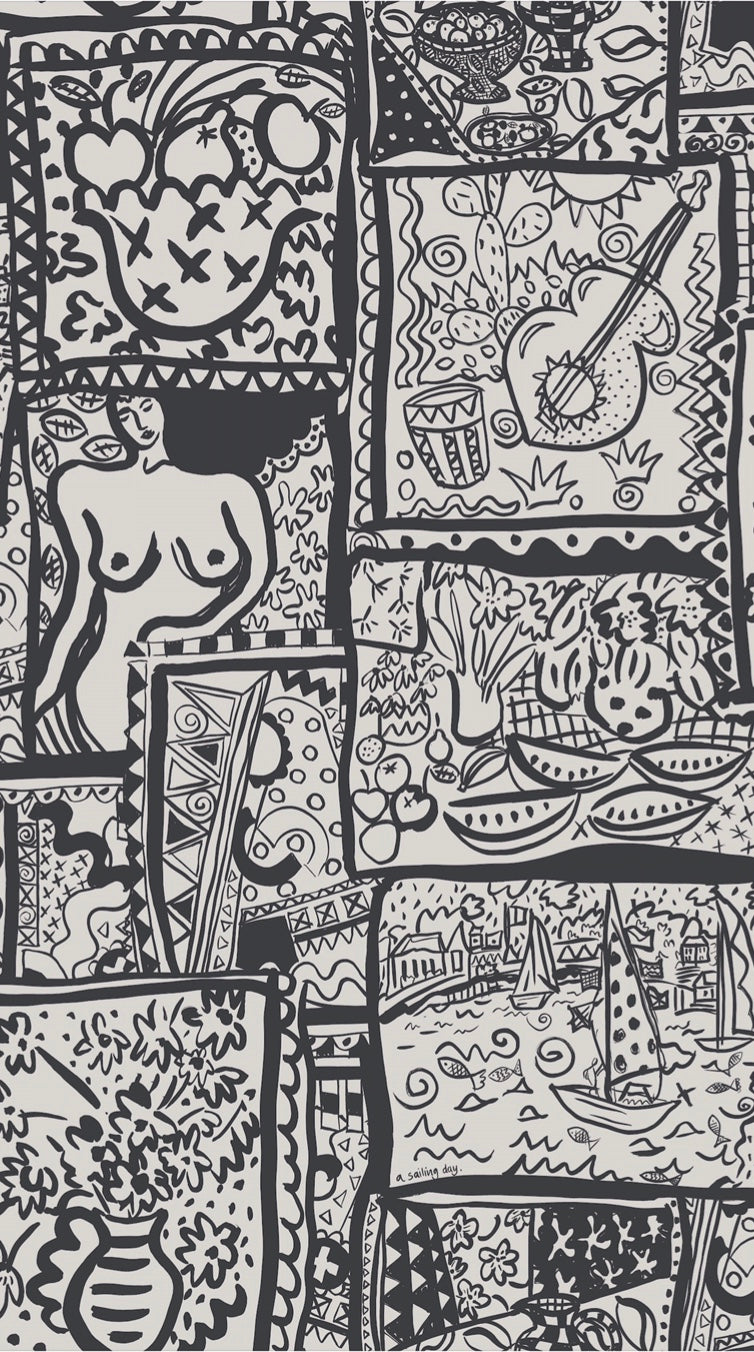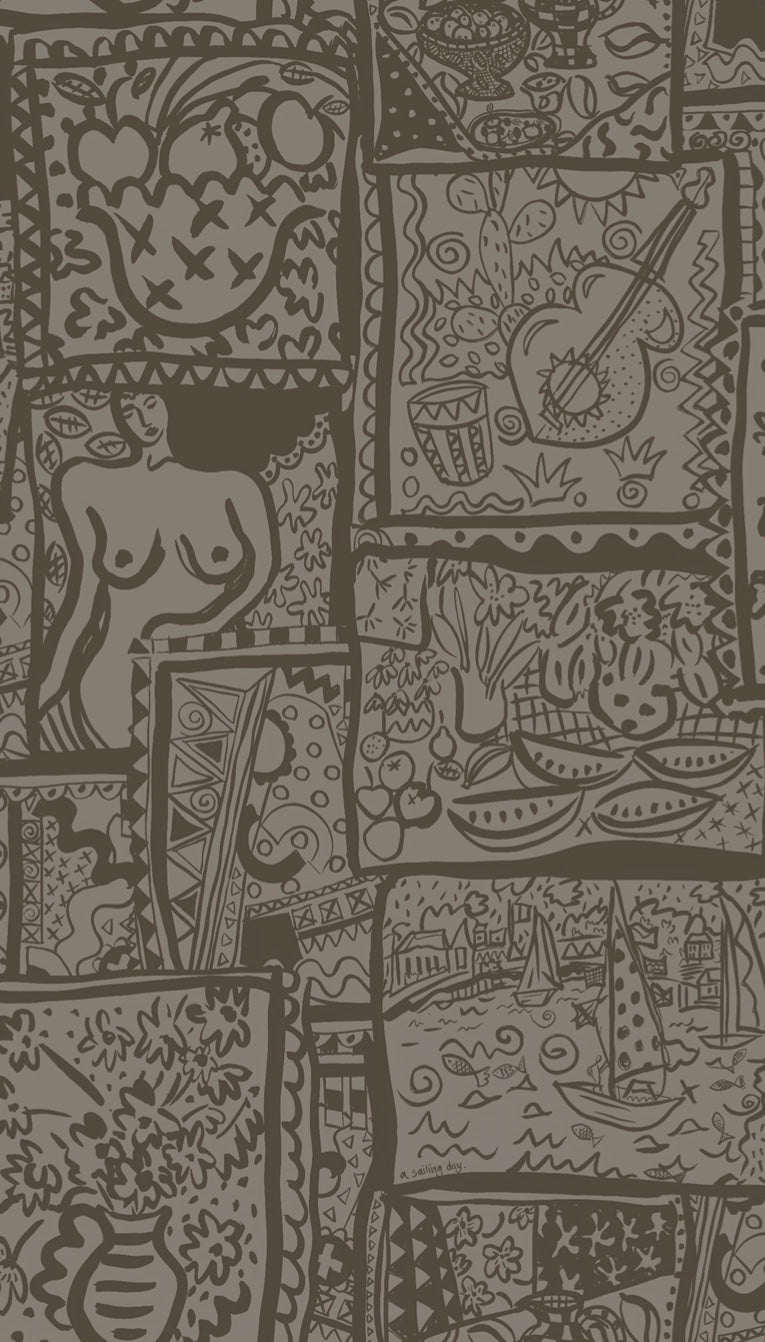 WISH YOU WERE HERE WALLPAPER,  A design inspired by holiday snaps and memories of good times on vacation. Postcards, of sailing boats, silhouettes of lounging sunbathing figures and holiday excursions. Designed in our studio, the wallpaper is based on a series of screen prints from our new collection.