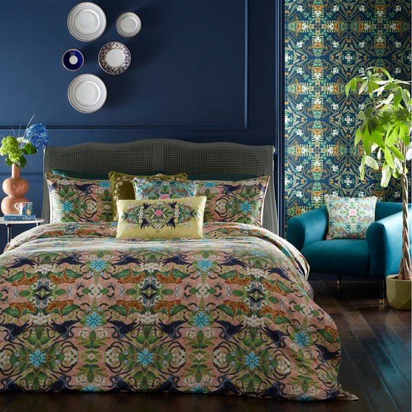 Celebrating a menagerie of the most unusual flora and fauna butterflies majestic inky cranes and stalking leopards are hidden amongst unexplored kaleidoscopic patterns over a blush ground. With this rhythmic print creating bold and glamourous highlights from its exotic creatures a light and celebratory story unfolds on the 200 thread count cotton sateen bedlinen. Pops of aqua marry beautifully with the soft sumptuousness of blush and the drama of the inky blue each leopard creating a sunset orange highlight. A blush piped edge and blush reverse create a dreamy balance between the lush tropical backdrop and delicate palette.