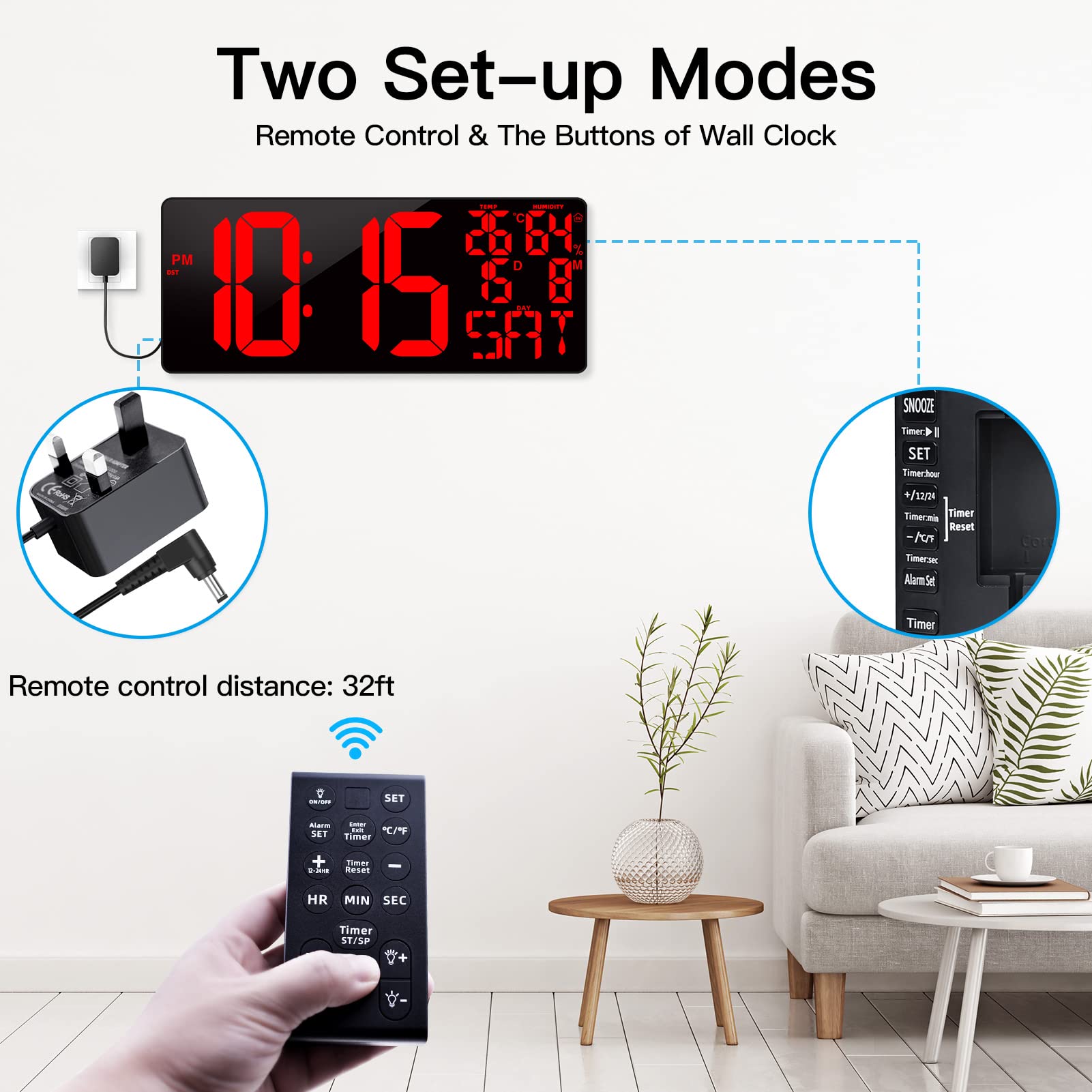• 【DIGITAL WALL CLOCK, DIGITAL ALARM CLOCK & DESK CLOCK WITH A POWER PLUG】--- The extra large digital wall clock has a power plug so you don't have to change the battery often.With 2 hanging holes and a folding stand, you can hang a oversized large wall clock on the wall in your living room, garage, gym, classroom, or put it flat on your desk in your office/home. Easy to set up, you can easily set it by the buttons on the back of the digital clock or on the remote control.