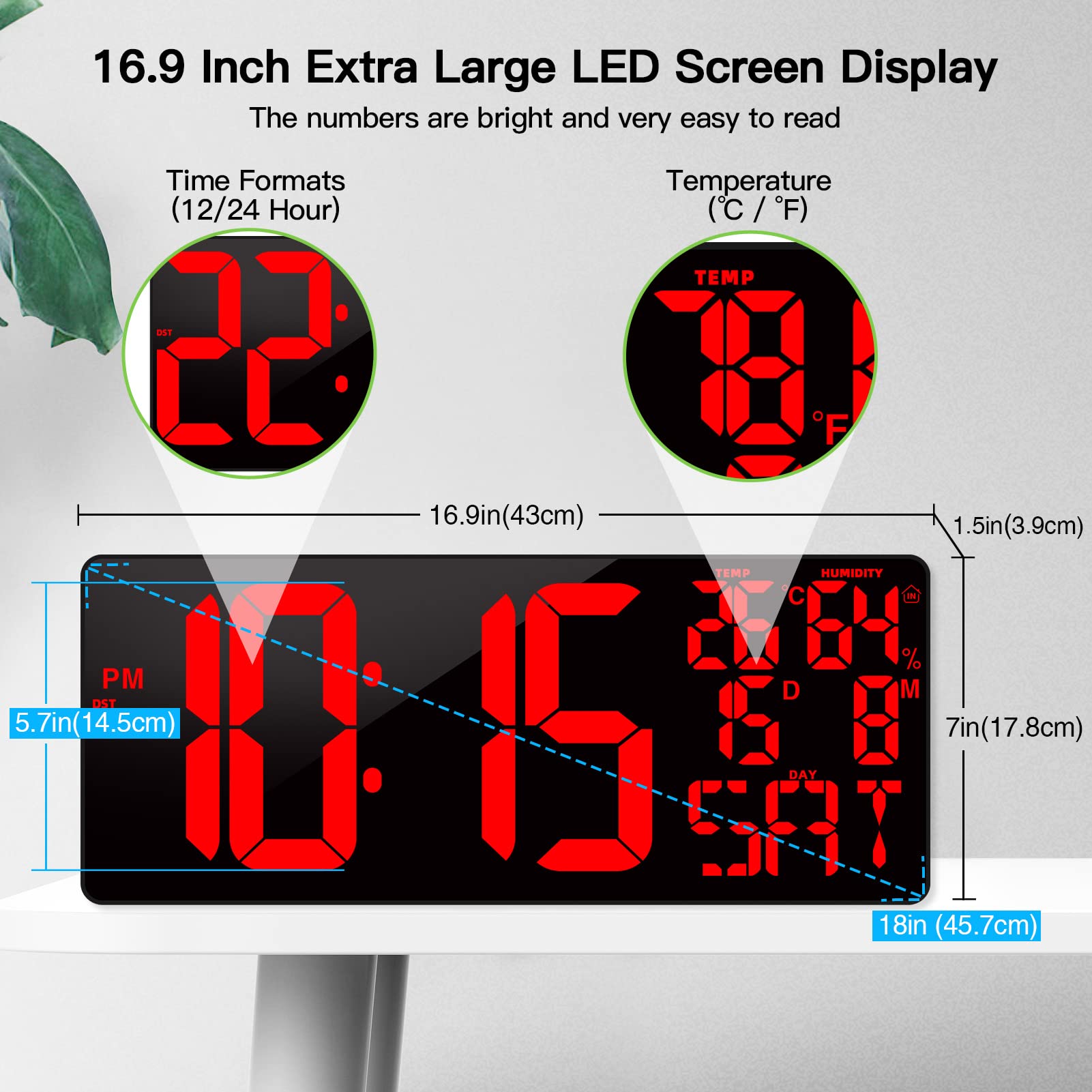• 【18 INCH EXTRA LARGE DIGITAL WALL CLOCK】 --- This large digital wall clock has 5.7 inches (14.5 cm) High contrast clear jumbo digits ensuring that anyone can read it clearly from a distance and from all angles. This led wall clock can show the time/week/date/temperature and humidity, bring you clear and comfortable visual sense. Great choice for home decor, office, classroom, gym, hospital, shop, garage, seniors & the visually impaired.