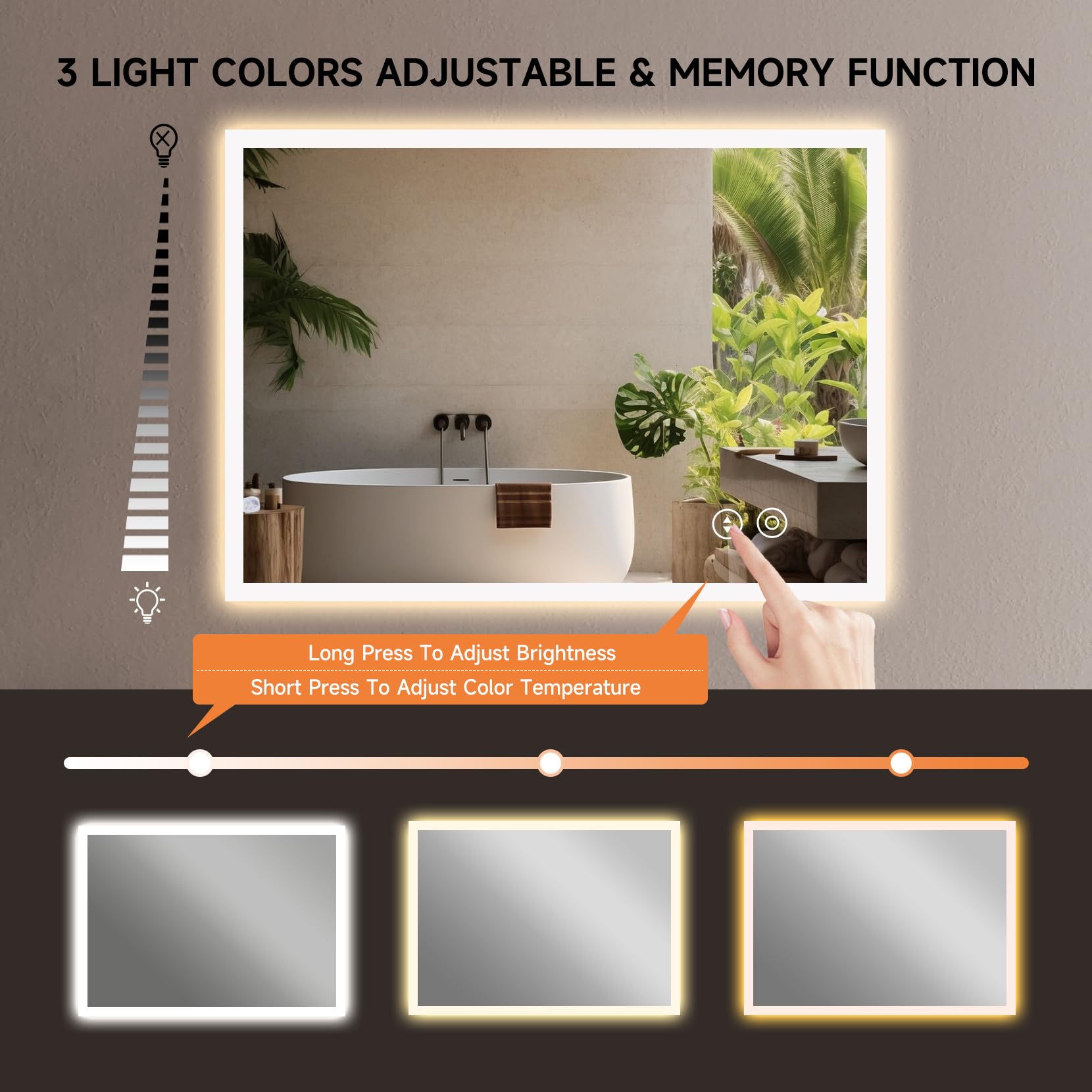 YOLEO Bathroom Mirror with LED Lights, 700x500mm Illuminated Bathroom Mirror, Wall Mounted Vanity Mirror with 3 Colors Dimmable, Anti-Fog, Touch Switch, Waterproof IP44, Horizontal/Vertical