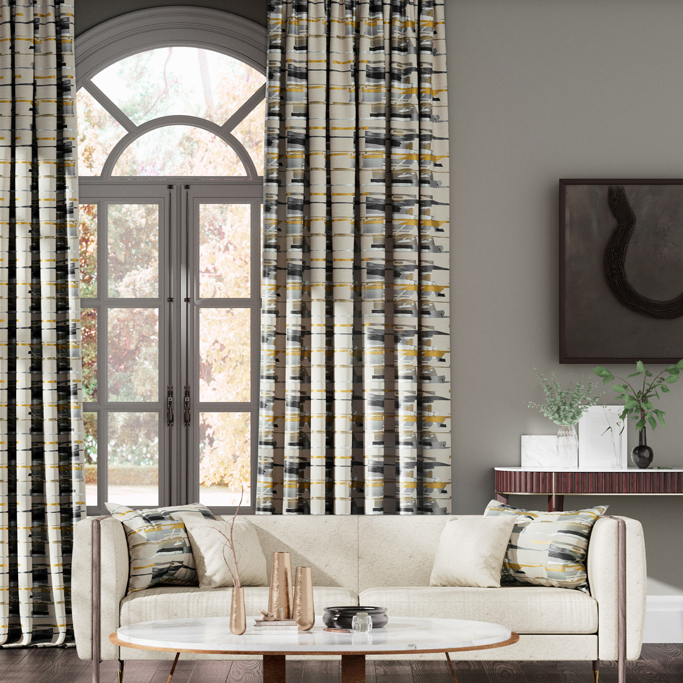 A painterly embroidery linen mix fabric resembling abstract brushstrokes in a deconstructed horizontal stripe in tonal colourways. Beautiful for blinds cushions and curtains.